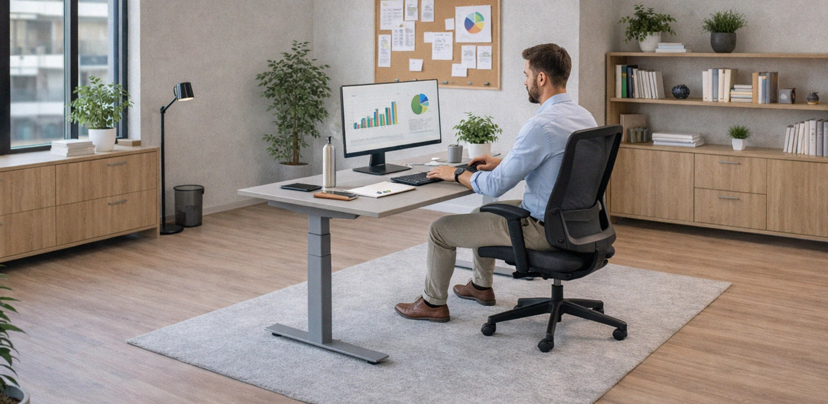 Elektropodizni uredski stol s pravokutnom pločom. Stol ima dovoljnu minimalnu i maksimalnu radnu visinu za veću fleksibilnost. T-postolje ima mehanizam za zaštitu od nekontroliranog spuštanja koji štiti od ozljeda.